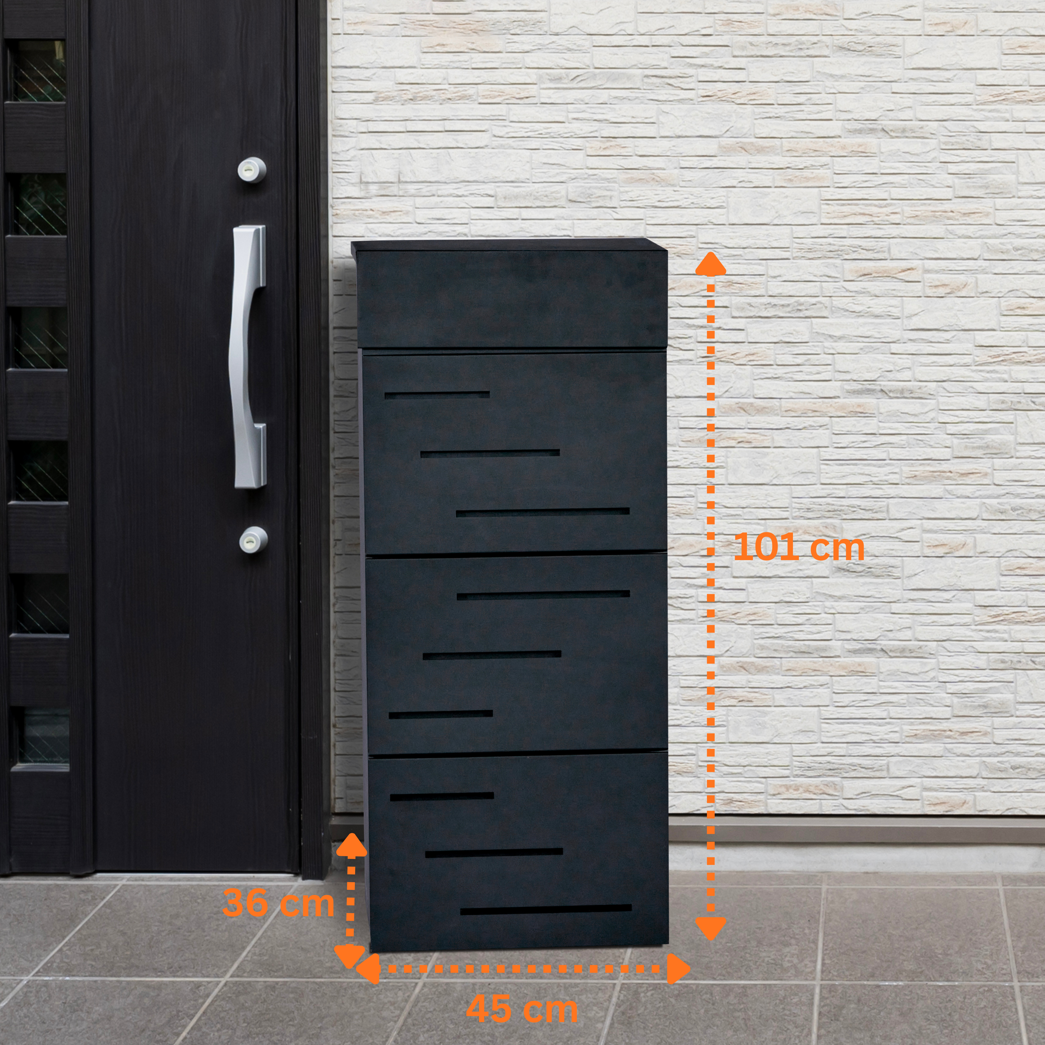 Atahome post&parcel delivery boxes come in three different sizes: Extra Large, Large, and Medium. Size & weight: (HxWxD) 101x45x36 cm - 19 kg.